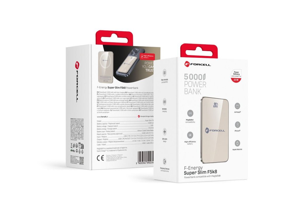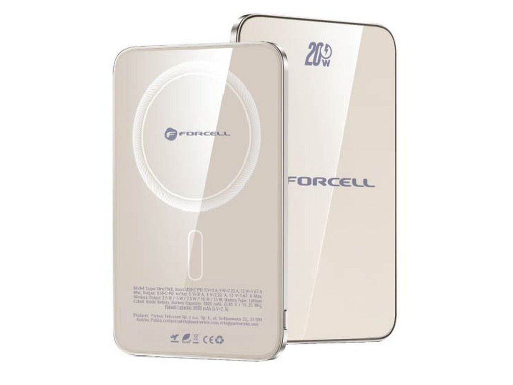 Forcell F5K8 je ľahká a kompaktná powerbanka s kapacitou 5 000 mAh, navrhnutá pre pohodlné bezdrôtové MagSafe kompatibilné nabíjanie. Vhodná na rýchle doplnenie energie počas dňa, či už v ruke alebo na cestách. Ponúka aj možnosť káblového nabíjania.