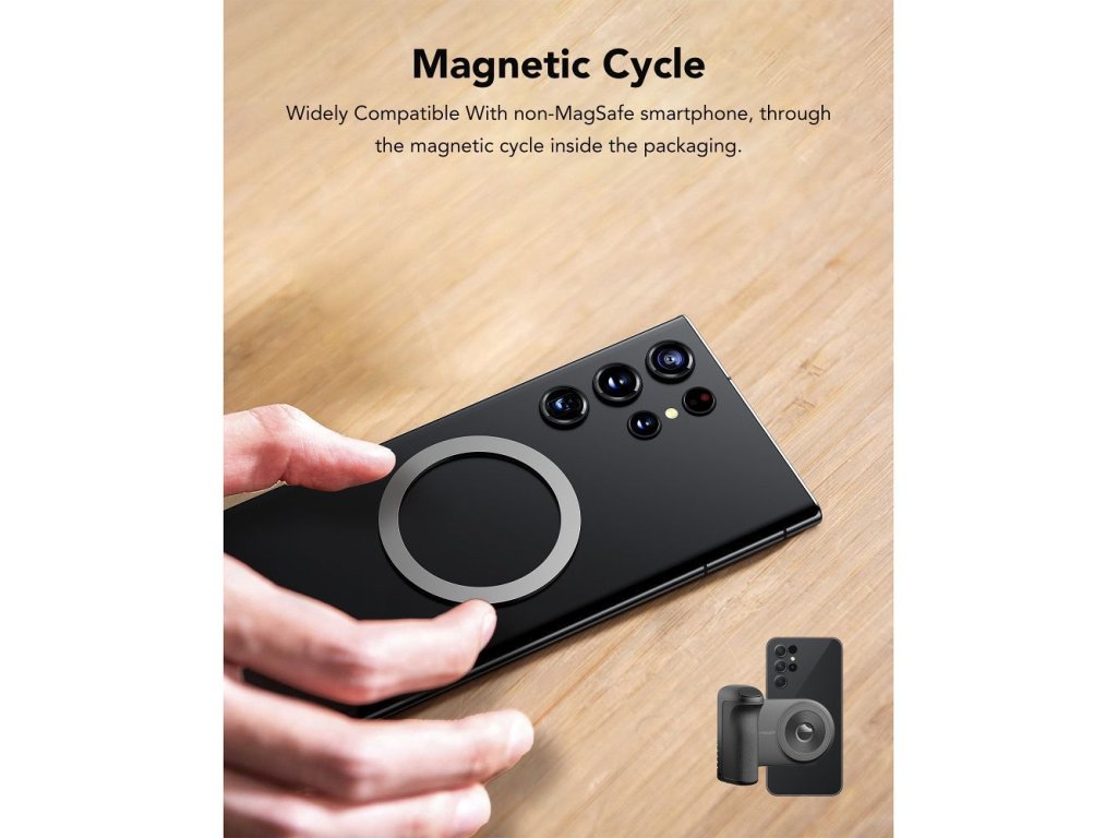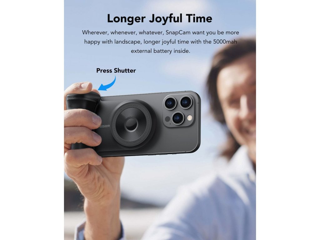 Veľkou výhodou je aj funkcia gripu so spúšťou fotoaparátu, ktorá umožňuje pohodlnejšie fotografovanie vrátane selfie na cestách. Zabudované Bluetooth ovládanie spúšte ocenia najmä milovníci autoportrétov, cestovania a tvorby obsahu. Grip zároveň zlepšuje držanie telefónu a pomáha stabilizovať záber. Skvele sa hodí aj pri dlhšom fotení, keď telefón potrebuje dodatočný zdroj energie.